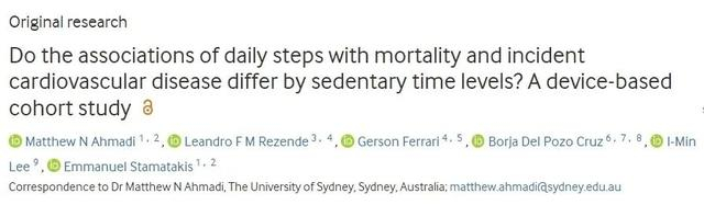 研究人员分析了英国生物银行数据库中72174名参与者,平均年龄为61岁,女性占58%,记录参与者每日步数和久坐时间的数据。在平均7年的随访期间,共记录了1633人死亡和6190起心血管事件。