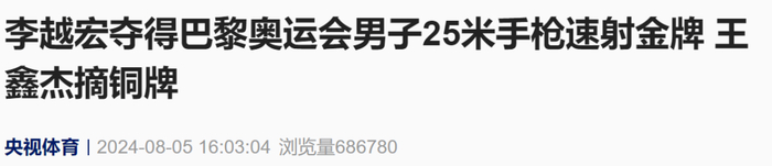 8月5日,在巴黎奥运会男子25米手枪速射决赛中,中国选手李越宏夺得金牌。这是中国代表团在本届奥运会获得的第20枚金牌。