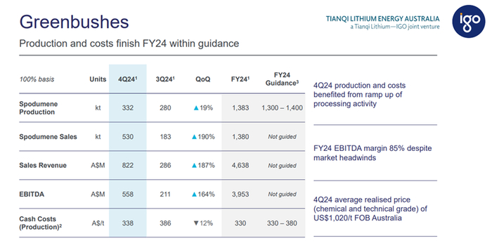 从指引的角度来看,我们预计Greenbushes将在2025财年继续不受限制地运行。产量指引的中位数(145万吨)只比2024财年完成的产量(138万吨)要高一点,成本指引在每吨320到380澳元之间。