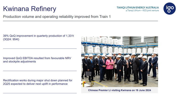 Kwinana在本季度也有一些改善。目前Kwinana最关注的是将在今年最后一个季度实施重大计划停产,这对Kwinana来说将是一个重要的里程碑。Kwinana团队正在为此做好充分准备,专注于运营的稳定性和过程控制,并尽最大努力管理资产。电池级材料的生产有了进展,销售也开始流动;而需要处理的积压库存,也恰好有客户们拿走了这些产品。