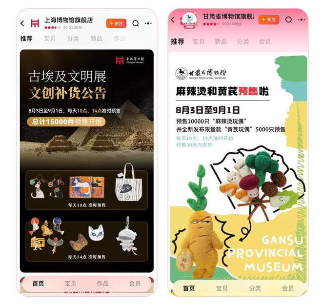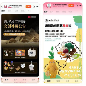 8月3日,上海博物馆在天猫旗舰店挂出店铺公告表示,8月3日到9月1日每天10点、14点两次在天猫独家补货古埃及文明展文创,总计15000件;同一天,甘肃博物馆也宣布会在同样时间段补货10000只“麻辣烫玩偶”,同时,5000只限量款“黄芪玩偶”也会同期在天猫独家首发。