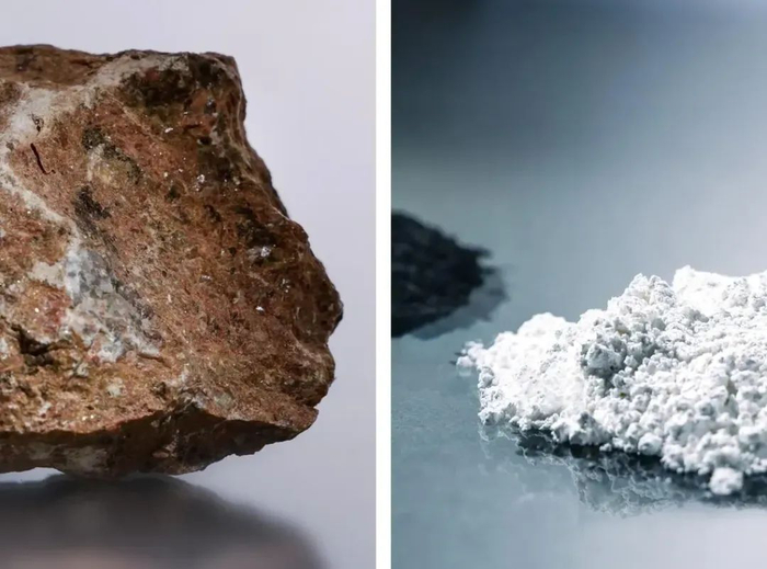 MP Materials公司从山隘口挖掘出的玄武岩矿石(左)中提炼出粉状稀土氧化物(右),比如这种镨钕氧化物。图片来源:MICHAEL TESSLER