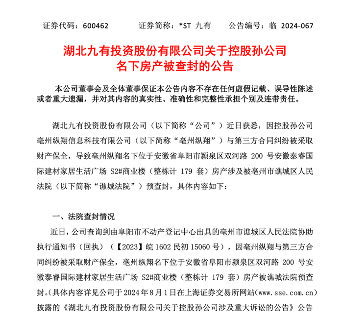 公告显示,*ST九有于近日获悉,因控股孙公司亳州纵翔信息科技有限公司(以下简称亳州纵翔)与第三方合同纠纷被采取财产保全,亳州纵翔名下位于安徽省阜阳市颍泉区双河路200号安徽泰睿国际建材家居生活广场S2#商业楼(整栋计179套)房产被谯城法院预查封。