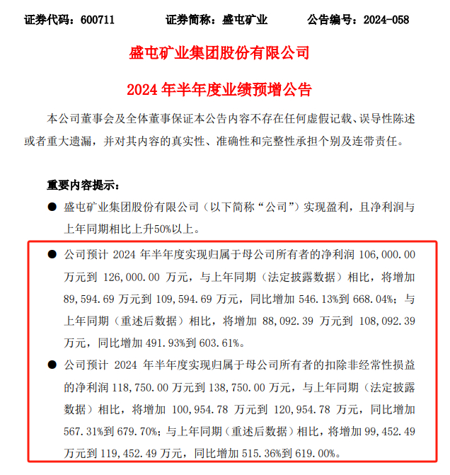 盛屯矿业曾于7月10日公布业绩预增公告:预计2024年上半年归母净利润10.6亿元-12.6亿元,与上年同期(重述后数据)比增加 491.93%到 603.61%;同期扣非净利润预计约为11.88亿元-13.88亿元,同比增加 515.36%到 619.00%。