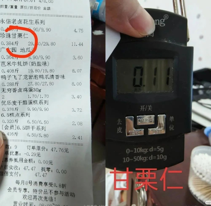 “买的东西并不多,但是花费四十多块钱。”在李先生所提供的门店小票中,购买的珍珠甘栗仁显示0.384斤,但是经复秤只有0.11斤,“实际重量连三分之一都不到!”