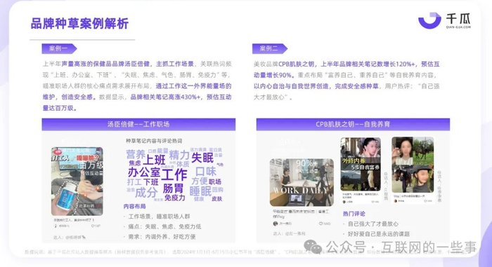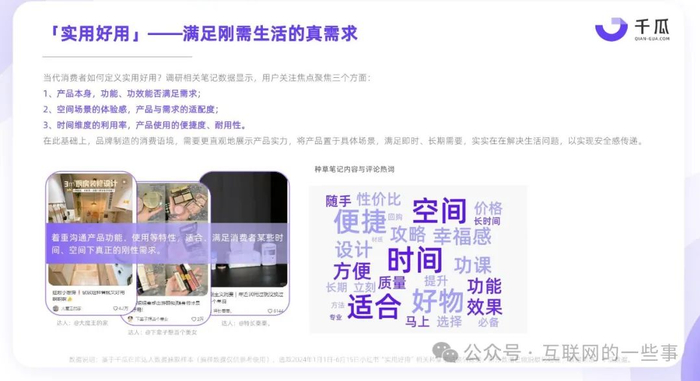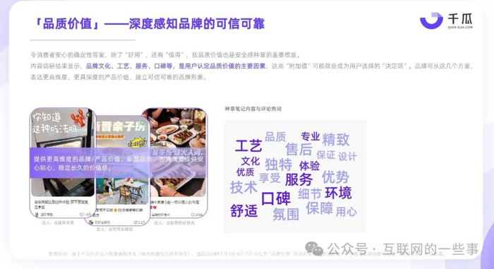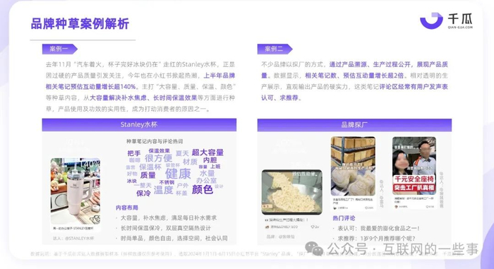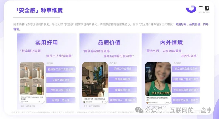 报告进一步分析了“安全感”的三大维度:实用好用、品质价值和内外情境。品牌在进行种草营销时,应关注产品的实用性、品质以及能够满足消费者情感需求的内外情境。例如,Stanley水杯因其过硬的质量和保温效果在小红书上受到追捧,而海底捞则以其优质服务提升了品牌形象。