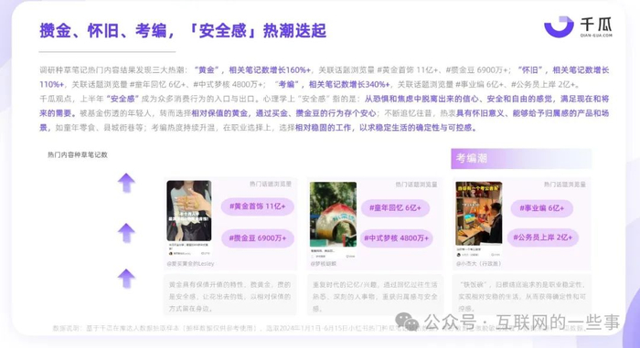 根据千瓜数据发布的《2024上半年小红书热门内容趋势解读报告》,小红书平台上半年的热门内容趋势主要围绕“安全感”展开。报告指出,在不确定性成为新常态的背景下,消费者对安全感的需求愈发强烈,这反映在对黄金、怀旧产品和稳定职业选择的偏好上。具体来说,与“黄金”相关的笔记数增长超过160%,而“怀旧”和“考编”相关笔记数分别增长了110%和340%。