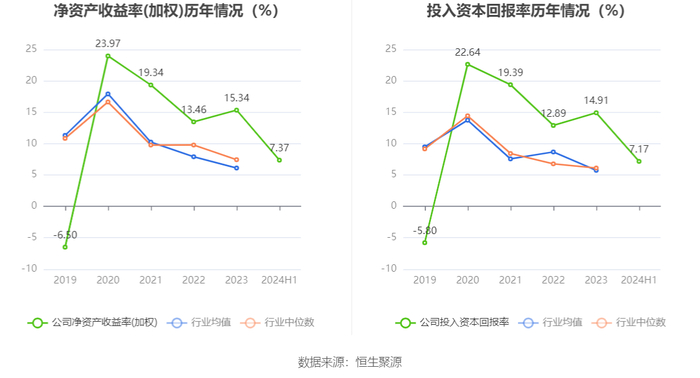 数据显示,2024年上半年公司加权平均净资产收益率为7.37%,较上年同期下降6.20个百分点;公司2024年上半年投入资本回报率为7.17%,较上年同期下降6.32个百分点。