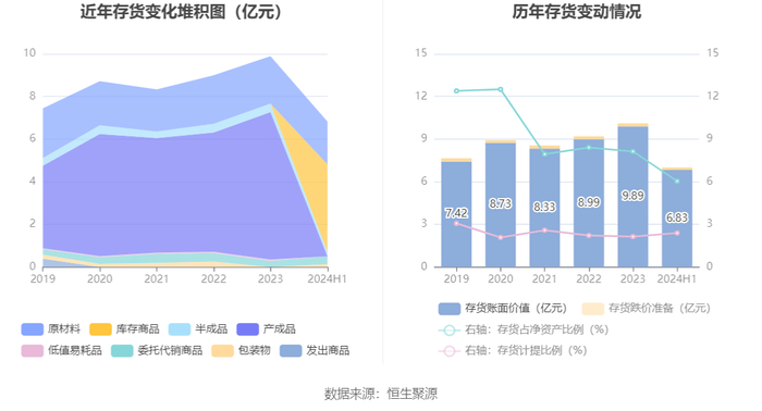 从存货变动来看,截至2024年上半年末,公司存货账面价值为6.83亿元,占净资产的6.04%,较上年末减少3.06亿元。其中,存货跌价准备为1670.7万元,计提比例为2.39%。