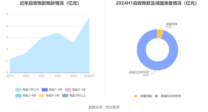 从应收账款账龄结构来看,截至2024年上半年末,公司账龄在1年以内的应收账款余额为4.81亿元,较上年末增长2.23亿元,占应收账款总额比例为99.7%,较上年末上升0.43个百分点。