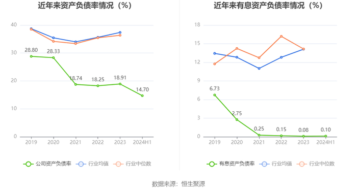 在偿债能力方面,公司2024年上半年末资产负债率为14.70%,相比上年末下降4.21个百分点;有息资产负债率为0.10%,相比上年末上升0.02个百分点。