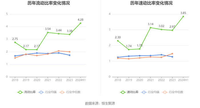 2024年上半年,公司流动比率为4.28,速动比率为3.85。