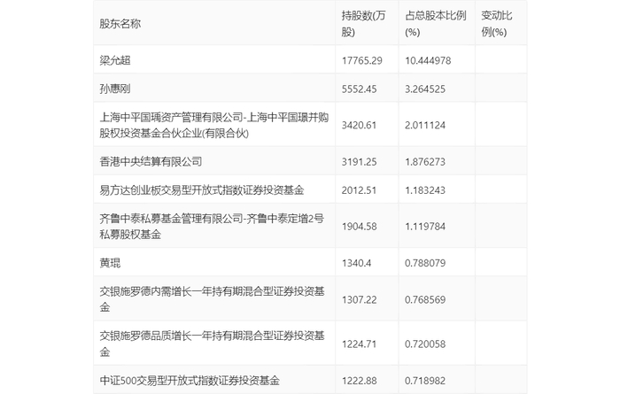 半年报显示,2024年上半年末公司十大流通股东中,持股最多的为梁允超,占比10.44%。十大流通股东名单相比2024年一季报维持不变。在具体持股比例上,中证500交易型开放式指数证券投资基金持股有所上升,香港中央结算有限公司、易方达创业板交易型开放式指数证券投资基金、交银施罗德内需增长一年持有期混合型证券投资基金、交银施罗德品质增长一年持有期混合型证券投资基金持股有所下降。