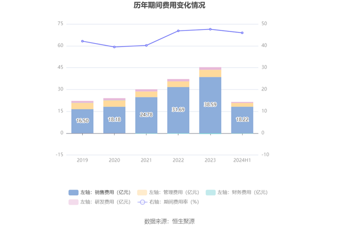 2024年上半年,公司期间费用为21.2亿元,同比增长3827.66万元;期间费用率为45.95%,同比增长8.75个百分点。其中,销售费用同比下降0.37%,管理费用同比增长23.49%,研发费用同比下降13.47%,财务费用-2550.49万元,去年同期-3307.39万元。