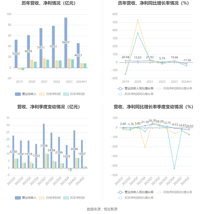 根据半年报,公司第二季度实现营业总收入19.67亿元,同比下降20.93%,环比下降25.66%;归母净利润1.64亿元,同比下降68.12%,环比下降77.36%;扣非净利润1.22亿元,同比下降73.48%,环比下降82.82%。