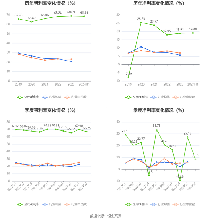 2024年上半年,公司毛利率为68.56%,同比下降1.76个百分点;净利率为19.08%,较上年同期下降8.91个百分点。从单季度指标来看,2024年第二季度公司毛利率为66.75%,同比下降3.57个百分点,环比下降3.15个百分点;净利率为8.19%,较上年同期下降12.57个百分点,较上一季度下降18.98个百分点。