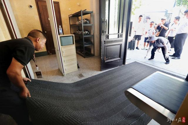 刘茂春(左)和同事铺放地毯、开启安检设备。9点开馆前,已有40多名观众等候入馆,其中大部分观众并不知道以往周一是闭馆日。