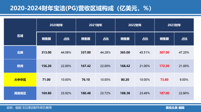 通过2020-2024财年宝洁(PG)营收区域构成,宝洁全球最强区域一直是其“大本营”北美地区,多年净销售额占比均超44%;其次,是欧洲地区,多年净销售额占比均超20%;“老三”大中华区,多年销售额均在10%左右。