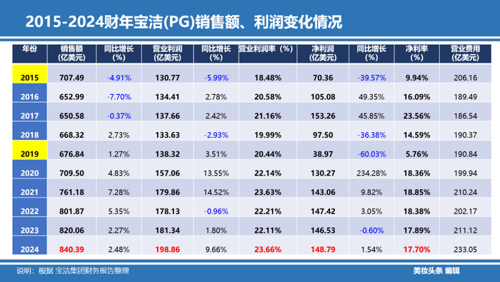 透过2015-2024财年宝洁(PG)销售额、利润变化情况,《美妆头条》发现:近10年来,宝洁这头“会跳舞的大象”净销售增长都是个位数,而且2015、2016、2017年连续三年下滑。实际上,如果往前翻,自2008年起至今17年,宝洁净销售增长都是个位数。