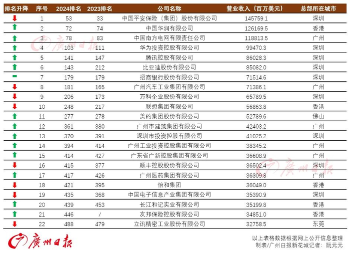 8月5日,最新的《财富》世界500强排行榜出炉。记者梳理榜单发现,粤港澳大湾区共有22家企业上榜,其中:深圳有9家,广州有6家,香港5家,东莞和佛山各有1家企业上榜。