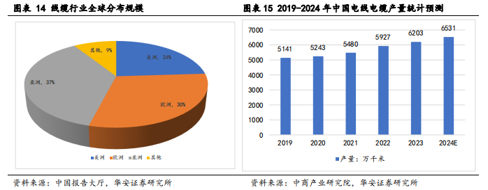 线缆行业逐渐向亚洲国家偏移,我国线缆产量逐年上升。从线缆行业全球分布规模来看,全球电线电缆传统制造国家主要集中在欧洲的德国、法国、意大利、西班牙等、北美以及日本、韩国等。近年来,随着亚洲新兴国家增长,电线电缆的生产重心向亚洲转移,带动了中国、越南、菲律宾和中东地区的埃及等国家电线电缆产业的快速发展。中国线缆产量逐年增加,未来,随着可再生能源的发展和智能电网的建设,电线电缆需求将不断增长。据中商产业研究院预测,2024 年我国电线电缆产量有望达 6531 万千米。