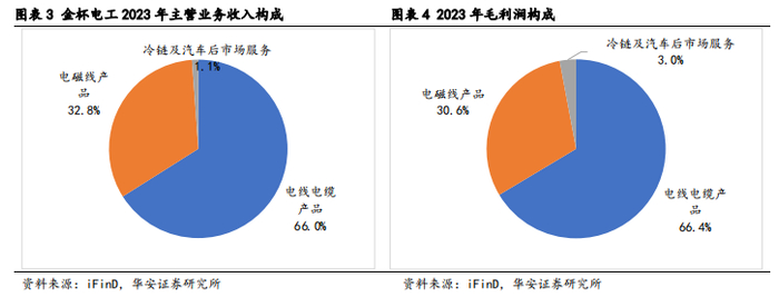 电线电缆以及电磁线产品是公司收入和利润的主要来源。2023 年公司主营收入主要由电线电缆、电磁线、冷链及汽车后市场服务三部分构成,占比分别为 66%、32.8%、1.1%。三部分业务占 2023 年毛利润比例分别为 66.4%、30.6%、3.0%。