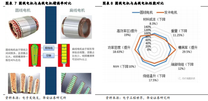 扁线电机优势明显,是未来电机行业发展的必然趋势。扁线电机是指定子绕组采用矩形扁铜线的电机,相比于圆线电机,扁线进一步提升了电机效率,具有以下优势:(1)体积小,功率高。相同功率,体积更小,重量减小约 11%;相同空间下,扁线电机可达 70%的槽满率,填充的铜可以增加 20-30%,产生更强的磁场强度,增加功率。(2)温度性能更好。内部空隙变少,扁线间的接触面积提升,绕组和铁心槽之间接触更好,热传导散热更好,提升电机性能。(3)减少铜耗。扁线电机通过提高铜满率,能够减少 40%的铜耗,降低电机损耗。(4)效率高。电机的平均效率将提升 1%-2%,全速效率提升 2-3%,扁线电机在中低转速的高效区域要大于圆线电机。
