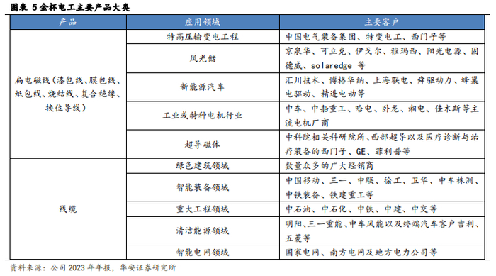 公司主营业务为电磁线产品、电线电缆产品、冷链及汽车后市场服务,其中电磁线以及电线电缆为公司主要产品。电磁线产品方面,公司拥有漆包、换位、绕包、线圈加工等生产作业单元,扁电磁线产品主要有漆包线、膜包线、纸包线、烧结线、复合绝缘、换位导线等,广泛应用于特高压输变电工程、新能源汽车、风光储、轨道交通装备、工业电机、特种电机、军工核电、超导磁体等领域。电线电缆产品方面,公司拥有“金杯”、“飞鹤”、“塔牌”、“赣昌”四大底蕴深厚、经销渠道成熟的线缆品牌,产品广泛应用于智能电网、工业装备配套、轨道交通(高铁、地铁、磁悬浮)、民生及新能源汽车(车内高压线缆、充电桩)、风光储、安防、核电等有特殊要求的领域,以及各类建筑、家庭装修、公建装修及各类安防控制、电气设备连接、控制等基础领域。