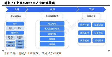 电线电缆是国内仅次于汽车的第二大制造业,下游应用空间广泛。电线电缆是用以传输电(磁)能、信息和实现电磁能转换以及制造各种电机、电器、仪器仪表等不可缺少的线材产品。线缆行业上游原材料中,电线的主要结构为“导体+绝缘”,电缆的主要结构为“导体+绝缘+护套”;导体由铜、铝或其合金制成绝缘和护套由橡胶、聚乙烯、聚氯乙烯等材料制成,其上游原材料价格的波动对线缆生产成本具有较大影响。电线电缆中游按用途分为电力电缆、电气装备用电线电缆、裸导线、通信电缆和绕组线五大类。下游应用范围十分广泛,包括电力、轨道交通、工程机械、建筑、通信、石油化工、新能源汽车、风电光伏、国防军工和核电等行业,为线缆行业提供稳定的需求。