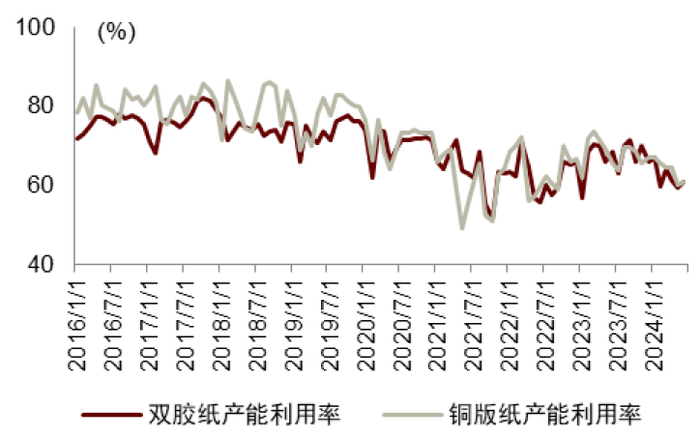回顾1H24:供需双弱,盈利承压。上半年内需继续偏弱、同时供给端仍有~50万吨产能投放,白卡纸价整体呈现下滑趋势,至年中基本底部企稳;在成本端浆价仍然高位、但纸价低迷下,我们估计中小厂仍在亏损边缘徘徊,行业产能利用率由年初70%左右下降至年中的60%。
