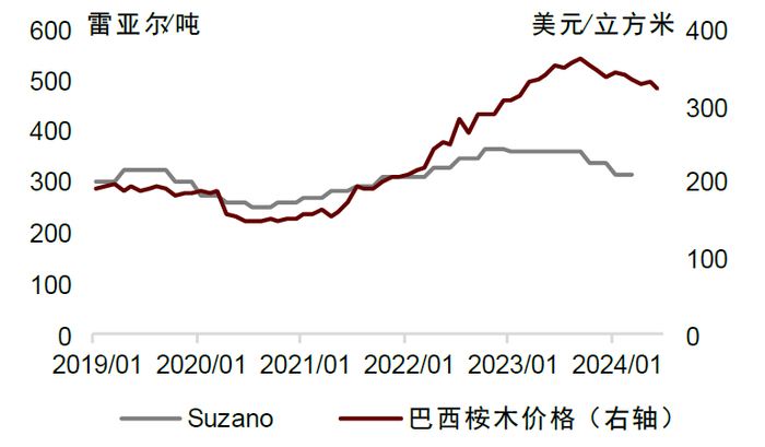 图表:Suzano单吨纸浆木材成本VS巴西桉木价格