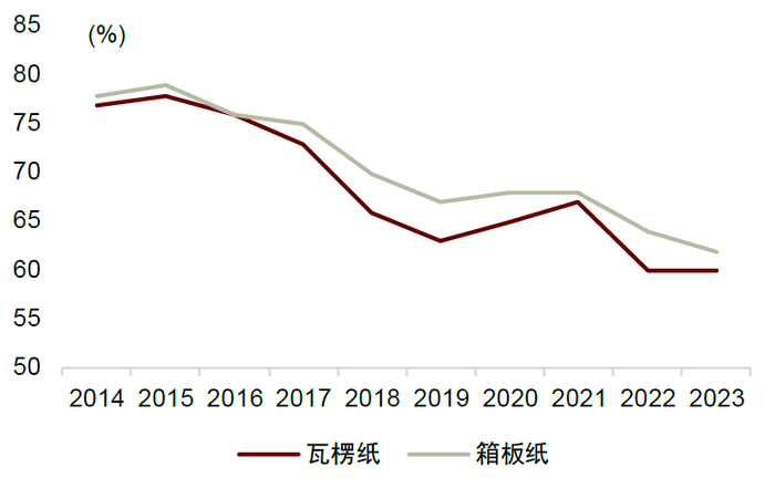 产能利用率视角:近三年产能利用率持续向下。近年行业仍陷入供过于求,我们不完全统计2023年行业新增产能超过700万吨,行业进入门槛低、且灵活规模小厂仍能有略微盈利——是该行业仍未止步扩产的原因,此外如前文所述,部分区域市场供需相对乐观,尤其是远离进口纸冲击的华北市场、供需良好的华东市场,区域中小规模厂商生产、停产均较为灵活,规模小、高库存周转下,在过去几年盈利可能优于大型龙头——是该行业难以实现产能清退的原因。据卓创资讯,近三年行业产能利用率加速下滑,2023年箱板纸、瓦楞纸分别62%、60%(vs 2014年的78%、77%),供过于求+出清困难下,我们判断产能利用率短期难见拐点。