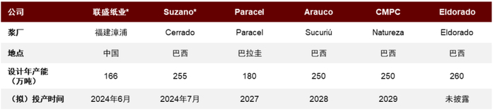 阔叶浆供给压力较大,龙头浆厂宣布多个大型新项目。我们观察到,近年全球投产的大型商品浆项目主要集中在阔叶浆,如23年相继投产的Arauco智利MAPA项目和UPM乌拉圭项目,合计产能约366万吨,占全球阔叶商品浆产能约10%(2023年口径)。往后看,我们认为阔叶浆新产能压力或持续,短期来看,一方面福建联盛于6月下旬投料试产的166万吨阔叶浆或对国内现货市场冲击较大,另一方面Suzano于7月下旬正式投产的Cerrado项目将在24年生产90万吨纸浆、其中70万吨将进入市场;中长期看,近期多家南美龙头浆厂宣布计划建设多个大型阔叶浆项目,合计拟增产能超900万吨,但我们提示,考虑到这些项目大多处于初期规划阶段、且当前宣布的投产时间均在2027年之后,不排除项目细节出现变动的可能。