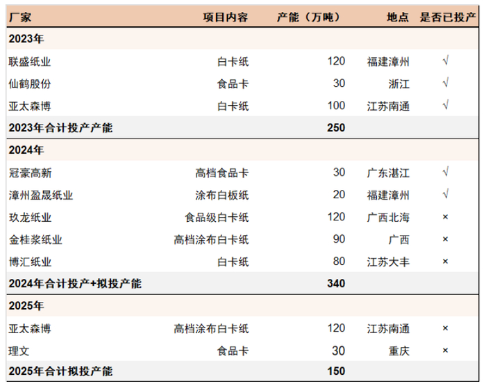 短期浆价或震荡下行。由于欧美补库周期渐趋尾声并步入淡季,中国市场重要性逐渐提升,叠加海外浆厂库存水平较年初略有回升,议价权从海外浆厂转移至国内纸厂。考虑到短期全球两大阔叶浆项目陆续投产,以及目前国内多数纸厂处于亏损状态、采购高价浆意愿低,我们判断浆价或延续震荡下行,尤其在国内现货市场,现货浆价或因联盛新产能投放领跌,故中小纸厂成本红利或先于龙头体现。但我们提示,考虑到新项目爬坡需要时间,如Suzano新项目需9个月满产、且公司表示新增供应将于24年末进入市场,短期新产能的实际冲击或低于预期;若国内下游复苏加速、传统旺季表现良好,我们不排除浆价止跌企稳的可能。