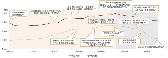 1H24浆价回顾:前期受意外扰动事件+欧美需求修复影响冲高震荡,后因供给改善但需求转弱而步入下行通道。