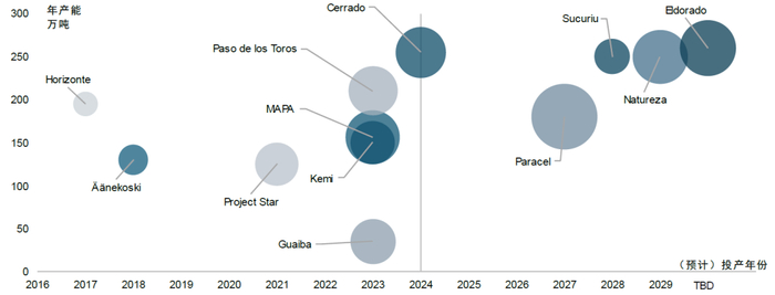 图表:2024年后全球(拟)投产的大型阔叶浆项目