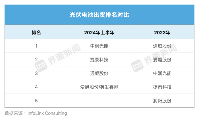 在上半年光伏遇冷期,电池环节出货量前五名大换位。