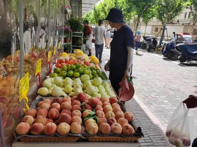 清晨,九华邻居里·新渔菜市场的水果摊位果香扑鼻。粉嫩的桃子、碧绿的西瓜、晶莹的葡萄……五颜六色的水果,释放着愉快的“多巴胺”,也抚平了几分燥热。