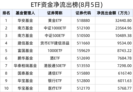 净流出金额超1亿元的有3只,黄金ETF(518880.SH)、中证1000ETF(512100.SH)、中证500ETF(510500.SH)资金显著流出,分别净流出3.24亿元、2.36亿元、1.05亿元(净赎回份额*单位净值)。