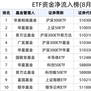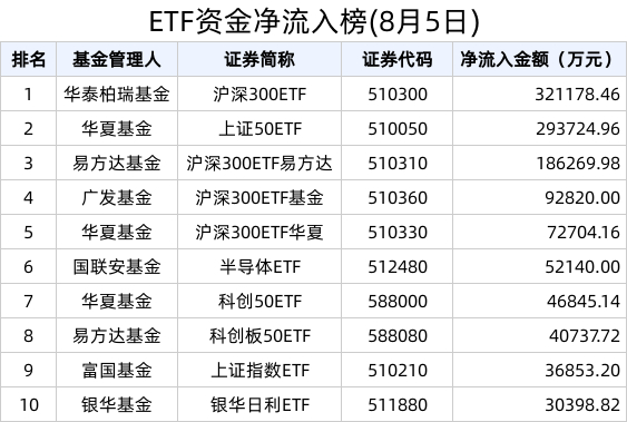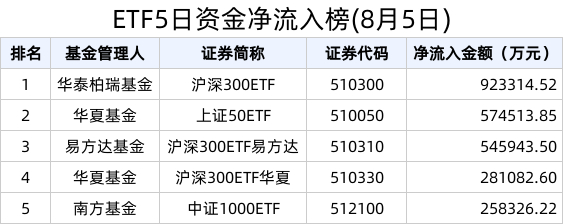 2024年8月5日共317只ETF基金获资金净流入,212只ETF基金净流出。净流入金额超1亿元的有21只,沪深300ETF(510300.SH)、上证50ETF(510050.SH)、沪深300ETF易方达(510310.SH)、沪深300ETF基金(510360.SH)、沪深300ETF华夏(510330.SH)资金显著流入,分别净流入32.12亿元、29.37亿元、18.63亿元、9.28亿元、7.27亿元(净申购份额*单位净值)。