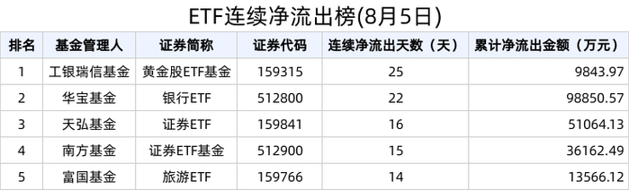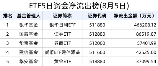 近5天累计净流出超过1亿元的有14只,金额居前的为银华日利ETF、证券ETF、券商ETF、货币ETF建信添益、黄金ETF等,分别净流出46.62亿元、8.65亿元、5.74亿元、4.25亿元、3.71亿元。其中,银华日利ETF近5天资金大幅净流出,基金规模快速下降至776.52亿元。