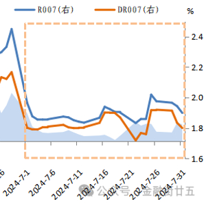 2024年7月,银行间市场7天质押式回购利率(R007)和存款类机构的隔夜7天质押式回购利率(DR007)的均值分别较6月下行10BPs、7BPs至1.89%、1.83%,隔夜回购利率R001和DR001的均值分别下行7BPs、6BPs至1.81%、1.75%。