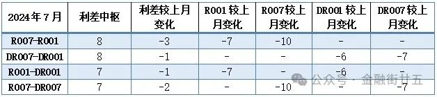表1:7月隔夜和7天期的R和DR类利率月均利差变化