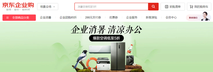 京东企业业务在“企业消暑”专场中,携手众多品牌伙伴带来覆盖室内降温、户外防晒、福利茶歇以及工厂环境、防洪防汛等企业采购场景的一站式商品物资的同时,还提供了爆款空调低至5折、美妆护肤低至2折、衣物清洁低至44折、必备药品低至68折以及茶歇整单低至85折的企业专享价、团购价等专属低价权益,有效助力企业采购降本提效。