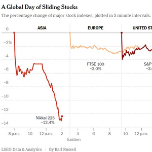 对美国经济陷入衰退的恐慌导致全球股市下跌。 《纽约时报》制图