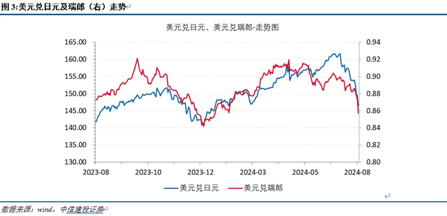 地缘政治局势对全球性的避险情绪起到推波助澜的作用。此前发生哈马斯、黎巴嫩真主党领导人的遇刺事件,中东局势恶化引发地缘政治担忧,日元、瑞郎等避险货币大幅升值。日元的升值是避险情绪上升的结果而非原因。