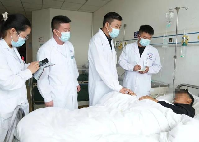 在日喀则市人民医院,胡健卫(右二)与徒弟张武(左二)、段颖骞(右一)、潘亚茹在病房内询问病人病情。
