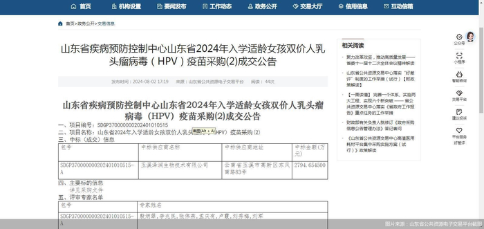 根据山东省疾病预防控制中心山东省2024年入学适龄女孩双价人乳头瘤病毒(HPV)疫苗采购的最新成交公告,沃森生物二价HPV疫苗的价格降至27.5元/支,再次刷新国产二价HPV疫苗的价格。在今年5月,沃森生物中标2024年海南省适龄女生HPV疫苗采购项目,其疫苗中标单价为63元/支。