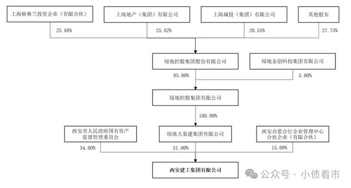 绿地大基建、西安市国资委和西安合思合行企业管理中心合伙企业(有限合伙)对西安建工的出资比例分别为51%、34%和15%,公司无实际控制人。
