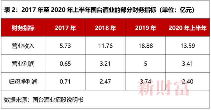 根据此前公布的一份招股书数据,2017-2019年,国台酒业的营收规模从5.73亿元快速飙升至18.88亿元,归母净利润从0.71亿元增至3.74亿元(表2)。2021年7月披露的上市辅导备案材料显示,国台酒业2020年营收达到40.05亿元,归母净利润达7.43亿元。